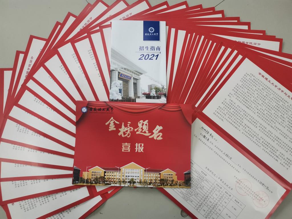 2021年招生简章,用快递方式将录取的喜报和招生简章打包送至各生源中学,一封薄薄的喜报,纸短情长,不仅传递祝福,更是将我校优秀学子成长成才的情况反馈给高中母校,向为我校输送优秀生源的高中表示感谢。